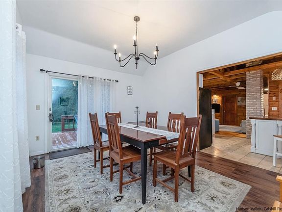 ?This charming ranch style home is a stone's throw from Bard/s campus in the quaint town of Red Hook. It is ideal for a family as well as a perfect live-work home. Right off Rt 9g with easy access to Rhinebeck, Taconic and Rt 9. This home is filled with rustic charm from it's exposed beams and log home style walls and sliding barn door. The open floor plan features a galley kitchen with a eating area, cozy living room with pellet stove and views into the separate formal dining area with vaulted ceilings. This home has 2 bedrooms including a recently added master bedroom that features a walk in closet, master bath, and office space. Master bedroom is equipped with radiant heat and a Mitsubishi split unit. Recently renovated furnace and siding in 2019, master addition 2019, and brand new water heater in 2022. Heading outside to the attached deck you will see a full fenced in yard, leading to the 14x24 detached shed with full electric hook up and 2.5 car detached garage.