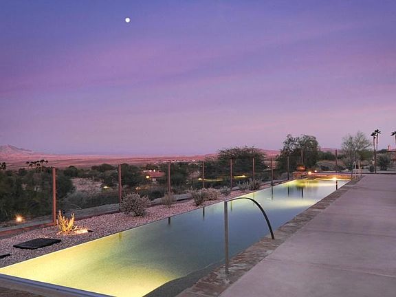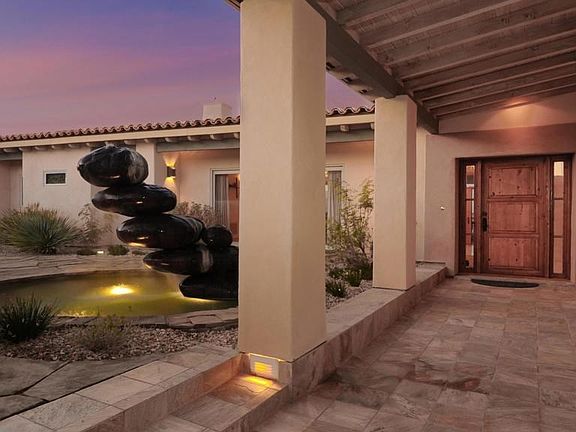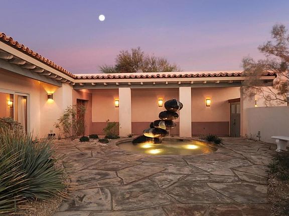 The ultimate Desert retreat at this custom, single level 4 bedroom, 4.5 bath, Rams Hill Estate sited above the 8th fairway of award winning Tom Fazio Golf Course. Spectacular mountain views, covered lap pool, enclosed courtyards with custom water features and iron work by John Richens. Features include spacious floor plan, wood & tile floors, lighted niches, custom stained glass by Bretta Matson, three fireplaces, covered terrace and 5 car attached garages. 2023-01-04