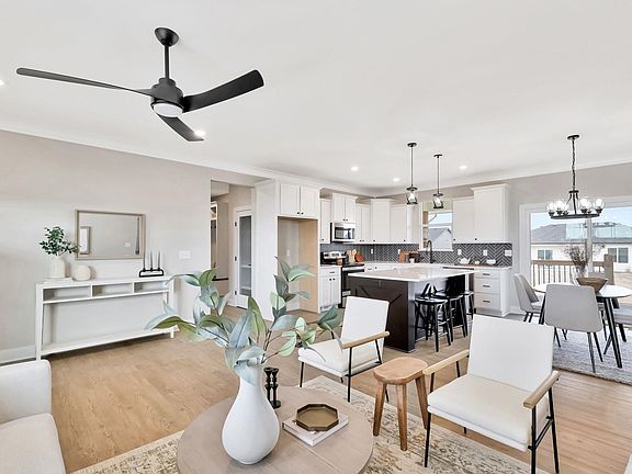 Come explore this gorgeous new home in Trinity Point Addition! This property offers 3 bedrooms and 2 baths, 1463 sq.ft, unfin.basement along with a spacious 3-car garage and 9 ft. ceilings. Inside, you'll find an inviting open living area featuring a 50-inch electric fireplace and stylish LVP flooring throughout. The kitchen is a chef’s dream, equipped with stainless steel appliances, including a microwave, dishwasher, and range oven. Offers a walk-in pantry and quartz countertops. Adjacent to the dining area is a lovely covered patio, perfect for outdoor entertaining. The thoughtful split-bedroom layout provides added privacy, with the master suite that has a walk-in closet. The master bath features a tiled shower, double sinks, and elegant quartz countertops. Main floor laundry included. Two additional bedrooms share a hall bath. For even more space, consider the basement finish options, which could include an additional 2 bedrooms, 1 bath, and a family room. With a covered porch and patio, outdoor living is made easy and enjoyable. Special taxes at only $139 per month. Options subject to change without notice. Don’t miss your chance to make it yours! Interior photos are from another property but the same plan.