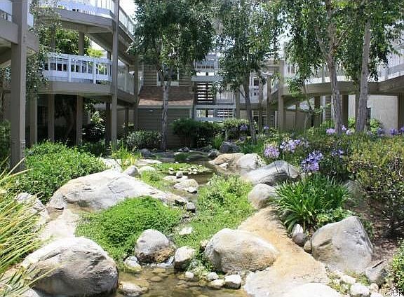 THIS CONDO CAN BE CONVERTED TO 2 BEDROOM , LARGE 1 BEDROOM WITH A DEN. Excellent open floorplan all one level has vaulted ceilings. This unit is a Penthouse top floor unit close to elevator. Shows very light. Large Master Bedroom with door leading to private patio, mirrored wardrobes, closet organizers. Master Bath has new tub, fixtures and stone features as well as a skylight. Pergo flooring, Corner fireplace connected at living room and den. Den will make a great office with built-in wall unit and wet bar. Kitchen with updated appliances, garden window and skylight. Large front patio for BBQ and relaxing listening to the sounds of the streams below. Inside side by side laundry, extra storage space on 2nd patio. One mile to beach, close to shopping & Huntington Harbour. This community is beautifully landscaped with waterscape features & flowing streams, cool ponds & lush foliage. There is one covered parking space and an abundance of guest parking in this security gated complex. Walk to Brightwater trails " Complex offers pool,spa, tennis, clubhouse. Water and trash paid by HOA which is a plus!