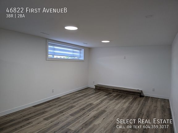 Address: 46822 First Avenue Description: Immaculately refinished basement suite. Features: 3 Bed 2 Bath 1141 sqft. Driveway Parking Lease Information: One-year Lease No Smoking No Pets Appliances Included: Fridge, Stove Washer, Dryer Microwave Furnace Hot Water Tank Tenant pays: Hydro, Gas, Internet/Cable Deposit: Half Month's Rent Utilities Split (50%/50%) Special Notes: Backyard Shared Professionally managed by: Select Real Estate 520 - 45715 Hocking Avenue, Chilliwack, BC