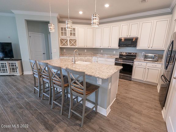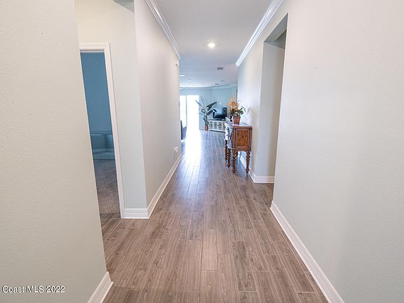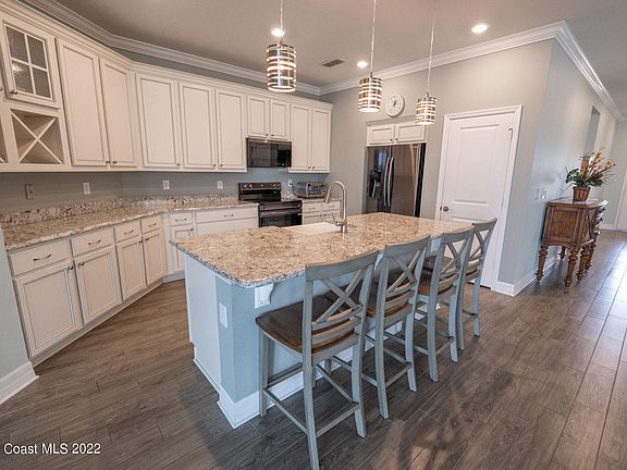 Welcome to this beautiful newly built 4 bed, 2 bath waterfront home in one of West Melbourne's most sought after neighborhoods. This home offers a desirable 3 way split floor plan, stunning porcelain wood tile floors, extended and upgraded 42'' kitchen cabinets and an oversized island with breakfast bar along with quality granite counter tops with stainless steel appliances including a new stove bought in 01/22. This home is equipped with crown molding throughout, a top of the line built-in speaker system and a beautiful master retreat nestled in the very back. Enjoy the practicality of its large laundry room with washer/dryer included. This home is very conveniently located with easy access to major roads and just a short drive to shops and restaurants. Call now to schedule a private tour tour