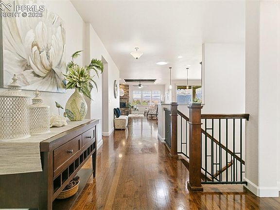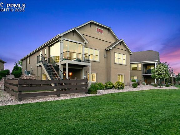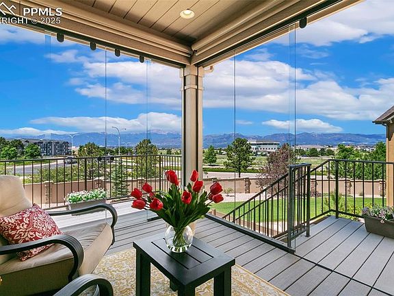 Experience effortless luxury in this stunning ranch-style patio home nestled in the award-winning Cordera neighborhood. With over 3,600 square feet of beautifully designed living space, this 4-bedroom, 4-bathroom home offers breathtaking, unobstructed views of Pikes Peak and the entire Front Range—truly a must-see! Built by Vantage Homes, this residence combines timeless elegance with modern comfort, featuring a stucco and stone exterior, a 3-car tandem garage (with epoxy flooring, fully finished and a bonus EV charger), and a lock-and-leave lifestyle ideal for low-maintenance living. Inside, enjoy rich wood flooring, exposed beams, a cozy corner fireplace, and fresh designer paint with custom shutters. The gourmet kitchen boasts an oversized island, abundant cabinetry, designer backsplash, under-cabinet lighting, and a spacious walk-in pantry. The main-level primary suite features sweeping mountain views, a walk-in closet, zero-entry oversized shower, and a stylish barn door. A walk-out basement adds flexibility with a secondary suite—perfect for guests or multi-generational living—plus a large rec room, wet bar, fireplace, high ceilings, and generous walk-in storage. The fenced backyard is ideal for pets or play, and the covered deck with custom wind walls allows for year-round enjoyment. Built in shades and heat too! Residents enjoy access to Cordera’s pool, fitness center, trails, parks, and top-rated D-20 schools. This home blends luxury, function, and unbeatable Colorado views!