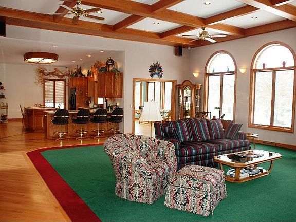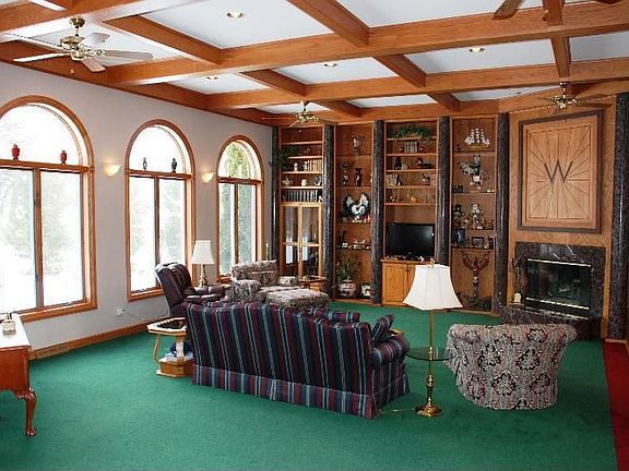 Perfect for entertaining, this ''French Chateau'' has spacious rooms & an ideal layout for parties. Custom designed on 4+ acres, with built-in display cabinetry, marble fireplace, soaring columns, hardwood floors, all-season sun room, custom tile work & a 32' X 40' outbuilding with electricity & water. Private and protected with a security system & electric gates, 3 car garage, sprinkler system. Close to I-43 for an easy commute. Some furniture included.