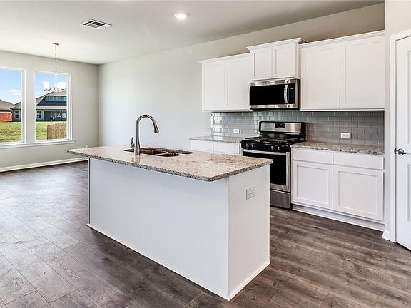 'Houma EB' The Houma plan has a welcoming flow with 4 bedrooms and 3 baths. The open concept living, kitchen, dining area overlooks a corner back patio that is perfect for relaxing. The kitchen is designed with sleek cabinets, granite countertops and a subway tile backsplash and is equipped with stainless steel appliances that include a gas stove, dishwasher, and micro hood. This home is settled in Ridge at Morganfield, a new construction community with a Homeowners Association. This home comes with a 10-year warranty. All homes offer smart home automation, wood laminate flooring, fully sodded yards, and electric garages with garage door openers.