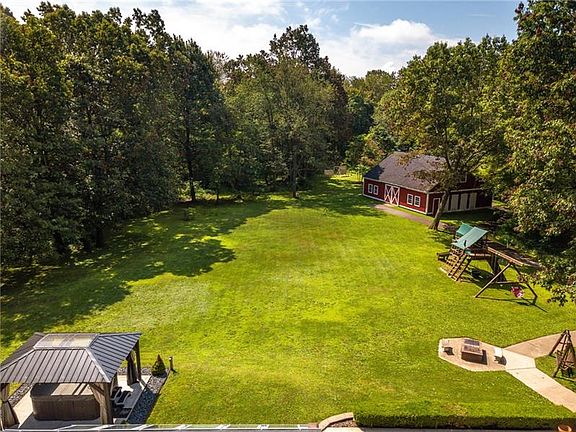 This upscale 6,000 square feet home is nestled perfectly upon a 25 acre estate. With a 2,000 square foot barn with unlimited possibilities. There is NO oil or gas lease on this property. Absolutely Amazing with Granite from Finland & Sardinia, Cherry Book cases, Italian Travertino Marble, Ventian walls, second level foyer along with mechanical updates. Wonderful finished basement with full bath, wine cellar, storage and 5th bedroom option. The roof has just been replaced, hot water tank 2013, new electrical panel 2014 & painted barn 2015. You will love the home theater system, the upper level finished space in the barn, the outdoor gazebo with hot tub and fire pit. There is nothing available quite like this. The basement offers it's own access to the garage.