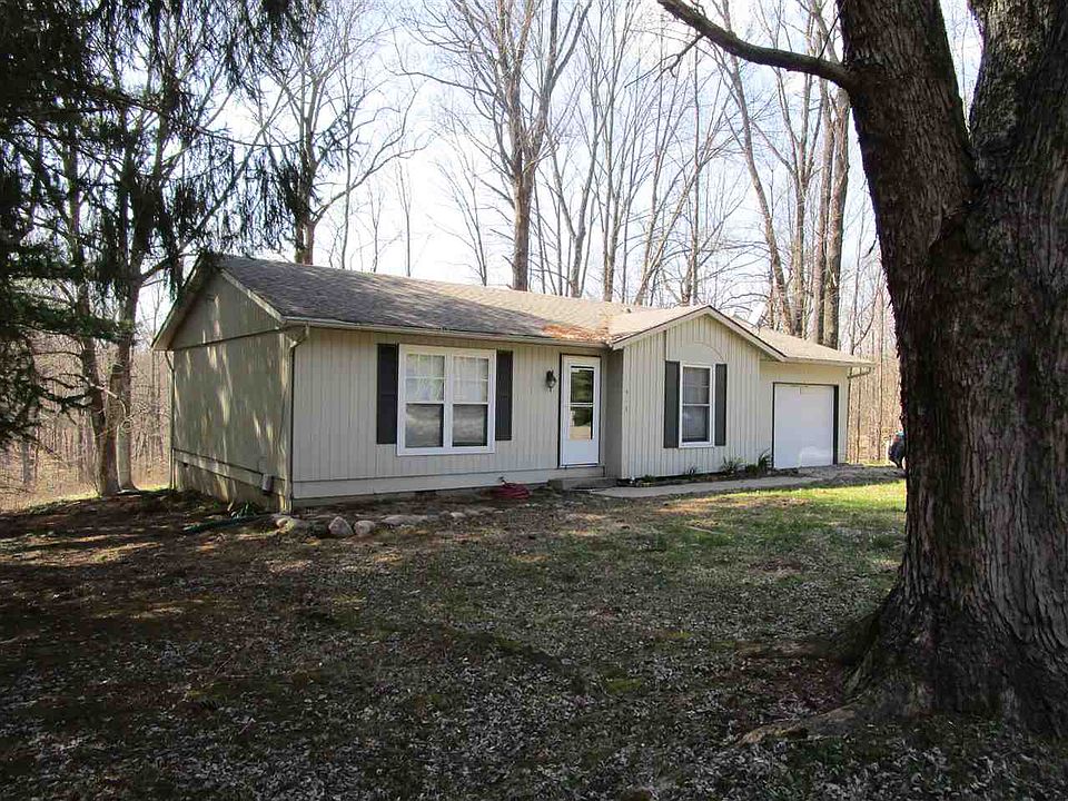 Looking for a country setting, with "near town" convenience? Look no further. Perfect little 1027 sq. ft. home with three bedrooms, one full bath, a main floor laundry and an attached one car garage, all situated on a beautiful, wooded .69 acre lot. All appliances are included--stove, refrigerator, dishwasher, washer and dryer. Large eat-in kitchen with pantry. New water heater was installed in 2017. Roof with 25 year shingles was installed in 2012. Insulation was added to attic in 2013. New garage door in 2009. Beautiful private views into the yard and woods beyond. Fantastic play set stays with the property. Low taxes. Vectren gas. County takes care of snow removal. Five miles to east shopping and campus.