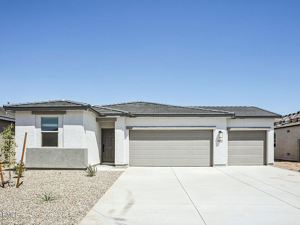 The Poppy floor plan is a popular single-level home that spans 2,071 sq ft of functional living space. This home offers a versatile floor plan, featuring 4 bedrooms, 3 bathrooms, a den, and a true 3-car garage. A flexible den area offers a dedicated space for a home office, study, or additional living area. Impress your loved ones with a stunning kitchen that features 42'' upper gray shaker cabinets, quartz countertops, black hardware, and a white subway backsplash. Escape to your oasis in the primary suite, where getting ready is a breeze with dual sinks, a large walk-in closet, and a generously sized bedroom. This home feels bright and open thanks to the open-concept layout, 9-foot ceilings, and the 4-panel center glass slider. The Amarillo Creek community offers mountain views, several parks, pickleball, and basketball courts, and is conveniently located near Route 347 for easy commuting to Phoenix, Chandler, and Mesa. Just minutes away from the array of dining, shopping, and entertainment options that Maricopa has to offer.