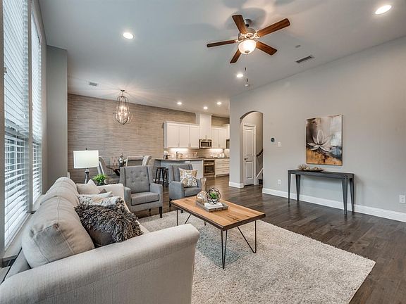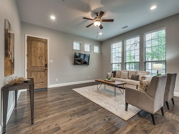 HOA dues paid throughout 2020 on this Bristol townhome plan with numerous UPGRADES!! Master bedroom downstairs. Wood flooring throughout first level. Oversized master shower! HUGE walk in closet. Quartz countertops, stainless steel appliances including refrigerator. Large bedrooms upstairs. Mounted TVs in downstairs living area and master bedroom included. Built with energy efficient features! OVERSIZED bonus room upstairs perfect for entertaining. HOA includes a clubhouse, swimming pool, lake with a walking trail. Great location close to the tollway, 121, Legacy Shops