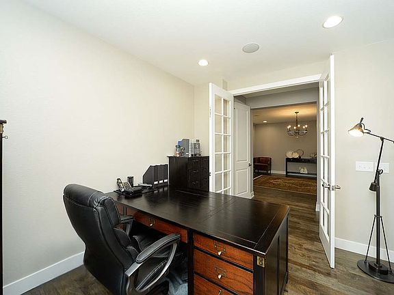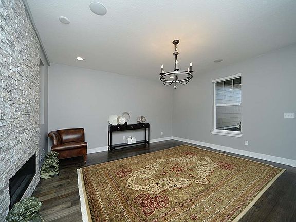 Amazing ranch home on quarter acre corner lot! Wood floors, tile & recessed lighting throughout! Covered front porch leads into living room with custom chandelier & double-sided rock fireplace. Family room shares the fireplace, has a ceiling fan & is open to eating space & kitchen. Eating space has custom chandelier & access to the covered deck out back. Entertain like a professional in the gourmet kitchen with pendant lighting over the over-sized island with a breakfast bar, stainless steel appliances, tile back splash & 42"cherry cabinets with granite counter top! Retreat to the master suite that features a 5pc bathroom that has a walk-in closet with custom shelving. 2 secondary bedrooms with fans share additional full bathroom. Laundry room & office with French doors also on main. Full, unfinished basement offers more space to grow into! 4 car tandem garage provides extra storage area! Close to parks, pathways, shopping & restaurants!