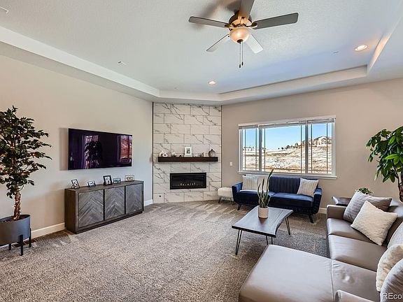 Welcome Home! Nestled in the scenic Buffalo Grass at Homestead at Crystal Valley area, this stunning, pride of ownership, single-family residence offers the perfect blend of modern elegance and Colorado charm. Boasting approximately 4711 square feet of thoughtfully designed living space, this home features 4 spacious bedrooms, 3 luxurious bathrooms, an office, and a 2-car garage—ideal for those who love to entertain, or for just hanging out in the serene backyard. Step inside to discover an open-concept main level with soaring 10’ ceilings, abundant natural light, and designer finishes throughout. The gourmet kitchen is a chef’s dream, complete with Miami White Quartz countertops, GE Profile stainless steel appliances, a large center island, and a spacious walk-in pantry. The adjoining great room, anchored by a 42” linear fireplace, flows seamlessly into a sunlit dining area.