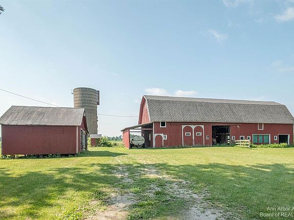 Enjoy idyllic country living just minutes from Saline, Tecumseh, and US-23 on this picturesque 15-acre farm with updated 3000+ sqft farmhouse, barn, and several outbuildings! The home has the perfect mix of classic farmhouse touches like thick moldings, wood floors, and an enclosed porch with modern conveniences like an updated kitchen and bathrooms, new sump pumps and water heater, and a generator. Main level provides a sprawling LR with bay window and attached bedroom/study, a renovated open kitchen and dining area overlooking the enclosed porch and 2nd entry, and a family room with 3rd entry, half bath, and attached sunroom with access to the massive deck. Upstairs you'll find 3 more generously-sized bedrooms. The primary suite has its own private full bath with spa tub surrounded by windows and separate shower. Two more bedrooms share a 2nd full bath upstairs, including one with an attached office/playroom/nursery. Daylight basement off family room could be finished into another home office or rec space, while the rest of the mechanicals are housed in the basement off the kitchen. Outside are a huge barn plus three more storage buildings for vehicles or equipment and 15 tillable acres. Peace and privacy with the perfect view!