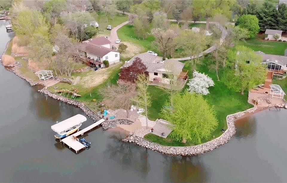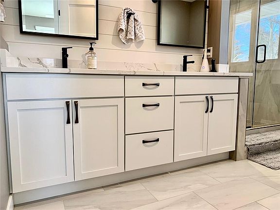 Waterfront brick home on flat lot with spectacular views of main basin and Burchfield Cove. Completely remodeled home with Hickory hardwood floors throughout main level & new carpet throughout. Kitchen has stunning quartz counters, stone backsplash, white cabinets, & SS appliances. Master bedroom w/private deck and large master bath w/tile shower, quartz counters, double sinks. Large new windows to take in the beautiful views and provide lots of light. Working from home? Enjoy the view from built in desk in large office. Professional landscaping includes 3 lakeside patios and a sandy walkway and entrance to lake. 97 ft of shoreline on .93 acres Schedule your private showing today