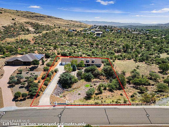 Nestled on a quiet street at the edge of the Yavapai Hills subdivision. A perfect blend of elegance and comfort with stunning mountain views bordering state land. As you enter the home, you will appreciate the open floor plan with large living room, rock faced fireplace, formal dining and the remodeled kitchen. The remodeled kitchen is a chef's delight, featuring knotty alder cabinetry, granite countertops, a large island, and stainless-steel appliances. Off the kitchen, convenient access to outdoor BBQ kitchen under covered patio for entertaining. Huge Primary Bedroom with totally remodeled bathroom. The spa-like primary bath features double vanities with granite countertops, a walk-in closet, a tiled walk-in shower, and an oversized tub.