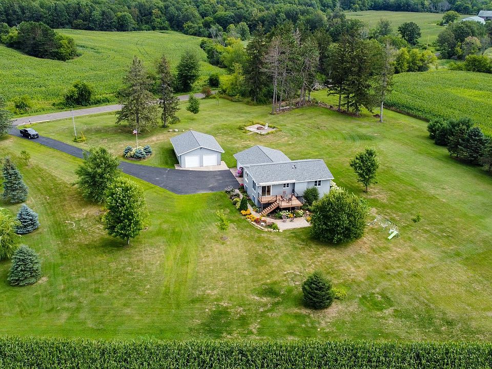 4 bedroom 3 bath country split level on 10 private acres with approx. 6 tillable acres. This home has been well maintained with many recent updates including new siding, shingles, exterior lighting, A/C, deck, sun-setter awning, appliances, water softener & french drains to name a few. You'll enjoy plenty of storage in the insulated heated 2 car attached garage as well as the uninsulated 2 car detached garage. Beautiful huge yard with perennials.