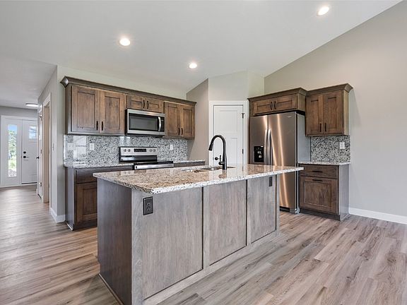 New construction ranch condo with 1,445 square feet of main floor living and expandable lower level. Your storage needs are met with a tandem deep 3rd stall 48' deep and 12' wide. (Also, zero entrance from the garage to the mudroom) Luxury amenities include hand milled and built cabinetry with solid wood and dove tail drawers, luxury vinyl flooring, solid surface counters, overhang island bar seating, walk-in kitchen pantry closet, drop zone bench seat and cabinetry. This splits bedroom ranch offers a 9' main side wall and open floor plan. South facing Pella windows provide an abundance of natural light. Enjoy the 12' x 14' covered patio with the neighborhood detention view. Primary bedroom offers a tray ceiling, a dual vanity sink, walk-in shower, and spacious walk-in closet. The open iron railing leads you to the expandable lower level with 2 egress windows and full bathroom plumbing stub. Condo association allows 2 pets and invisible fencing. $145/ month HOA for snow removal, lawn care, and exterior insurance policy.