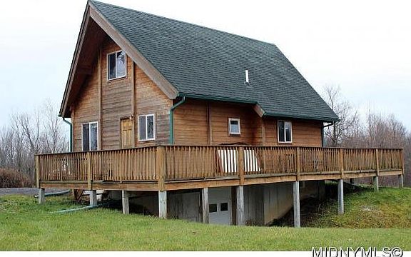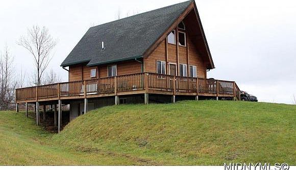 Beautiful Cedar Chalet on 6.6 acres. 2BRs, 1 bath, kitchen with breakfast bar, cozy lvr with wood stove, nice open floor plan, rustic Adirondack decor, awesome wrap-around deck. Bsmt has overhead door great for storing your toys. Stream in the back. Here's one you can enjoy!