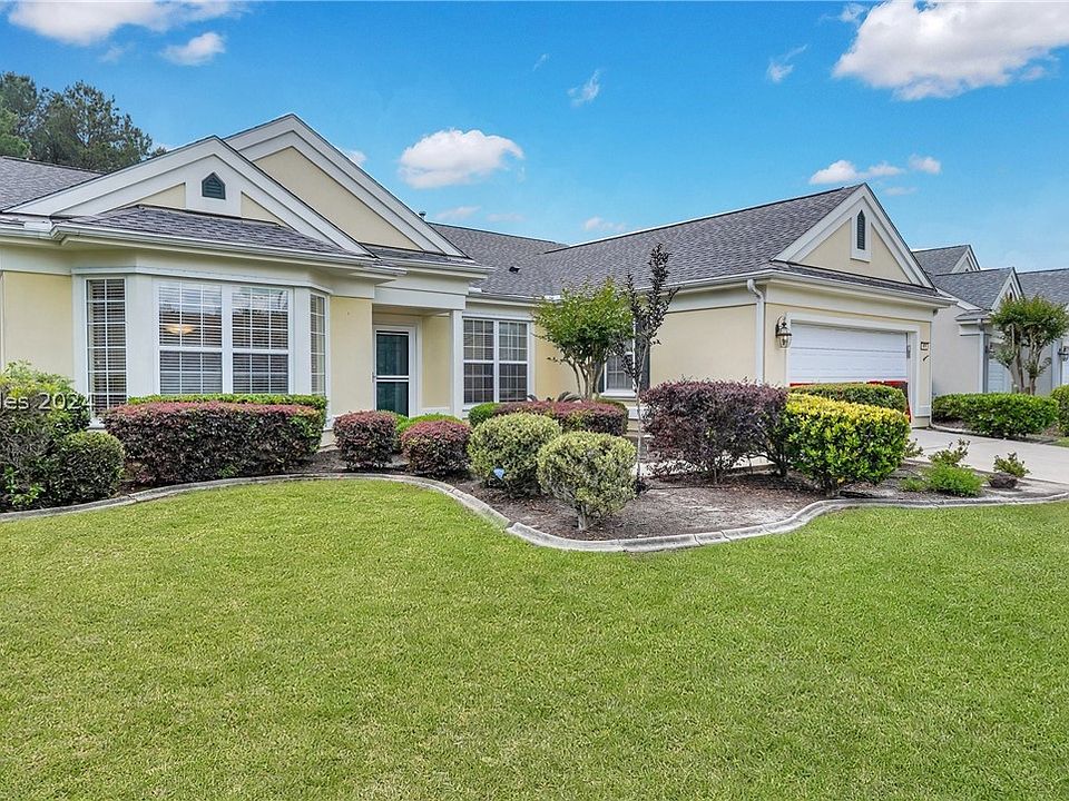 Rare Chestnut floor plan: 3 bedrooms, PLUS a den, PLUS a formal dining room! Inviting open floor plan w/Great Room & informal dining area w/three sliders to covered porch; kitchen w/stainless appliances, prep island, breakfast bar, pantry; Laundry room w/washer & dryer; den/office adjacent to the entry foyer. The primary suite has a bay window, walk-in closet, tile shower, 2 sink vanity, clerestory windows. Two guest bedrooms w/adjoining full bath. Mesmerizing lagoon & woods views. Large 2 car garage w/pull downstairs to overhead storage. Convenient location to Hidden Cypress Clubhouse & the Sun City Hilton Head activity areas.