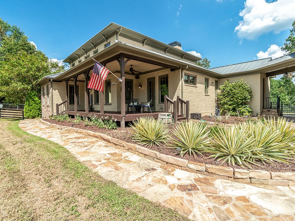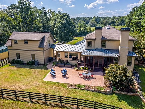 Charming, Spacious Brick Farm House on 4+ acres w/ fenced pastures, wooded area & lake frontage. Chef's kitchen w/ SS appls, island, granite, office space & walk-in pantry. Formal Dining Room, library/office & Family RM w/ beautiful stone FP. Hrdwd flooring & quality mill work. Mstr Suite on Main w/ FP & deluxe Master BA. Covered porches. Terrace level w/ 2 BD's, oversized closets, full BA, media, exercise & laundry. 3 car garage w/ well-appointed In law suite/potential Air B&B 2 stall barn, full size riding arena. Desirable Cherokee County with Top-Rated Schools.