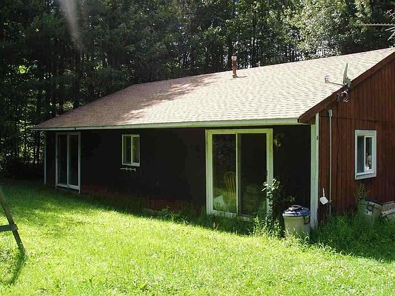 Set back cozy/secluded 3 br ranch w/detached garage barn on 3.2 acres. Easy on heating in the winter. Well insulated. Hallway laundry. Large cleared yard. Wooded acreage. Great starter home or for downsize. Garage will easily house a semi-truck. House and appliances sold as-is. Heat propane or pellets.