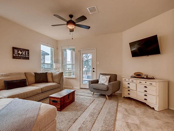 Enjoy "outdoor/back-yard living" on the covered patio with the majestic Texas oaks that provide both shade and privacy, or just go a few feet down the street to the beautiful neighborhood park. Highly desirable neighborhood includes all the amenities & pocket parks throughout.Open concept home includes low maintenance tile flooring, granite counter tops with extended island in the kitchen, spacious master with his & her white marble sinks, & bonus shelving in the laundry room & garage.