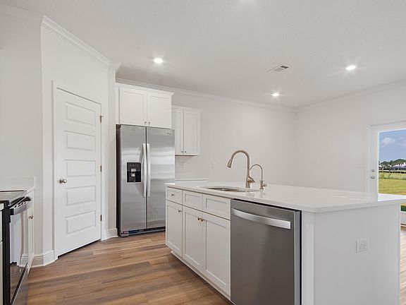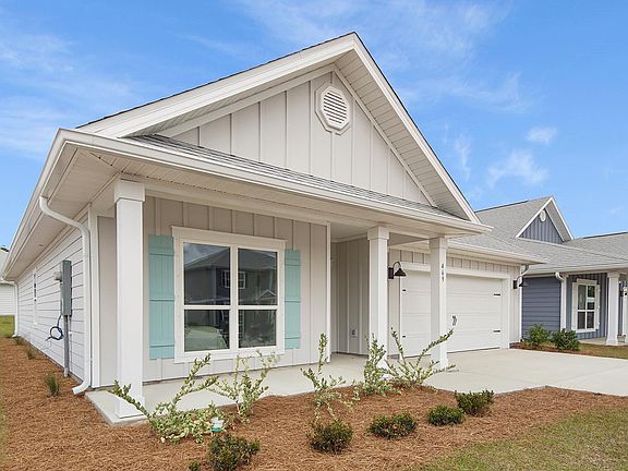 Bayside at Ward Creek is at the heart of Panama City Beach, accessible by sidewalk to Pier Park, Frank Brown Park, and the Conservation Park with the Gulf of Mexico less than 3 miles away. | The Rhett floorplan is a one-story, four-bedroom, two-bathroom home with over 1,700 square feet of living space. All three guest bedrooms are locate in front of the home. The kitchen is towards the center of the home that features white cabinets and granite counter tops with large center island that opens up to the dining area and living room. The primary bedroom is split from the three guest bedrooms. The primary bathroom has a standing shower as well as a full soaker tub, double vanity sinks, and a large walk-in closet.