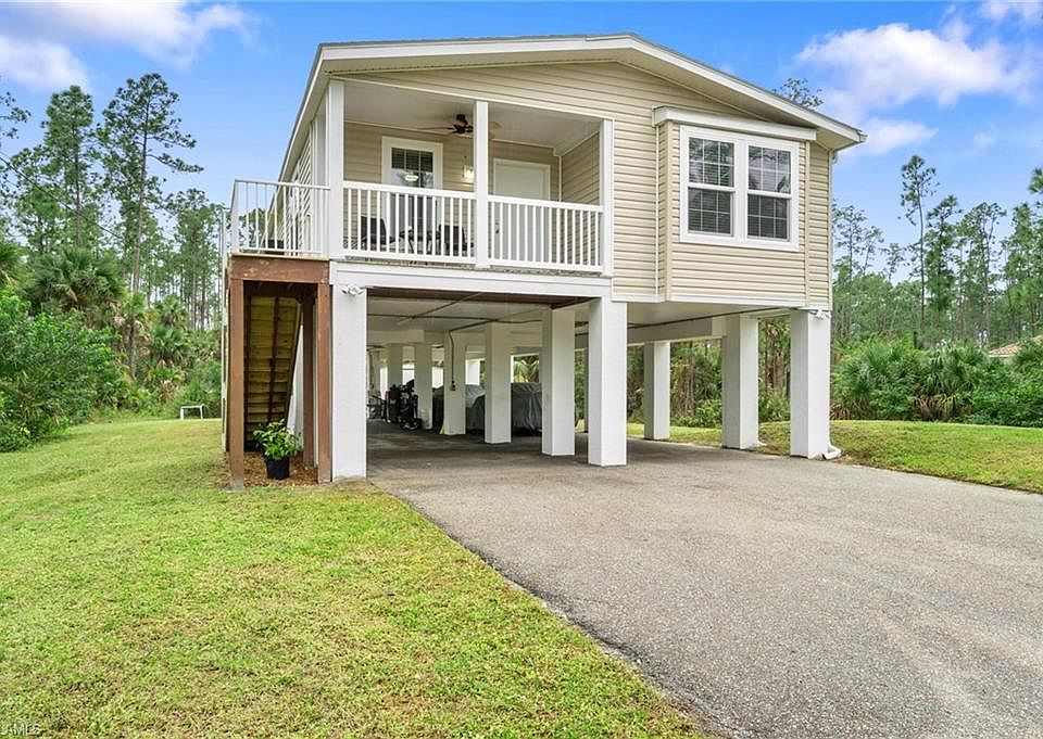 Golden Gate Estates living allows freedom with NO HOA fees, rules or restrictions! This modular home is 1,591 sqft under air and offers three bedrooms, two bathrooms along with ample covered parking beneath (4+ cars). Built in 2017, this home sits on a spacious 1.14 acres and is ready for you to create your own backyard oasis! Inside, the open floor plan creates a welcoming atmosphere, making it perfect for entertaining or family time. Brand new dishwasher, hot water heater and stairs!