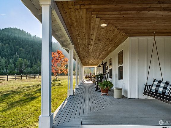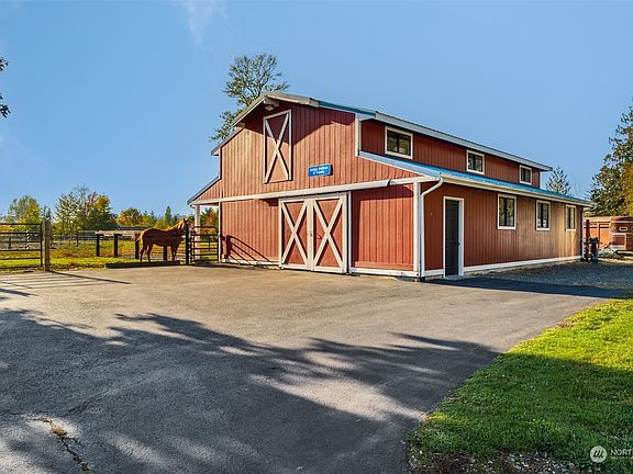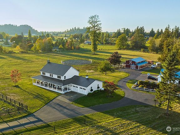 Captivating 360° views & unparalleled privacy highlight this quintessential Enumclaw Estate. Additional tax parcel w/ building potential. 2,550 sq.ft. Primary home offers exquisite interior design striking the perfect balance of comfort & elegance. Completely remodeled in 2015 w/ feat. like French oak flooring, coffered ceilings, & upscale bathrooms. The kitchen is bright w/pasture views & high-end app. including a gas Wolf range. 4-stall barn w/hay storage, round pen & sprawling New Zealand fencing make for an equestrian paradise. Detached 720 sq.ft. finished space w/shop is like-new & the perfect place to relax. Generac generator. Gated entrance, paved drive & wrap-around porch welcome you home to 13+ acres of Heaven on Earth.