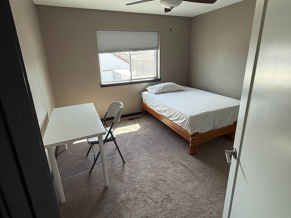 Spacious 11' X 11' private room with carpeted floors, a queen sized bed, large window, ceiling fan, desk, and a 5' X 2' closet with hanging and shelf space. Private Bath with a shower and tub. Lease Terms - 6 months or 1 year Utilities are covered by Landlord (Owner of the property) Cats are welcome and possible small dogs. Tenant (person renting) is expected to keep up the common areas and overall property along with others in the property.