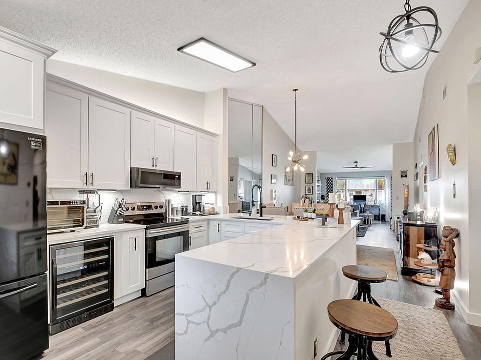 FOR ALL AGES! Make this beautiful, completely remodeled, modern, designer-inspired condo your new home! Schedule your showing today. This charming condominium has a great floor plan; it's light and bright and features a show-stopper custom-designed 2024 kitchen with high-quality 42'' cabinetry, quartz countertops, and backsplash, a large peninsula perfect for entertaining. Modern laminate flooring throughout. It's move-in ready with 2 Bedrooms and 2 Full bathrooms with remodeled showers. The primary suite has a spacious walking closet and access to the patio. Brand new washer-dryer combo. Top-of-the-line AC 2020 with Google Nest, excellent hurricane protection, and accordion shutters all throughout. Lucerne Greens is a friendly community with a great location close to the Turnpike, shopping, dining, and a 20-minute drive to the beach. New Roofs and gutters throughout the community. The 79-acre area is being developed to create a new community set to launch in Fall 2024. This project will feature new infrastructure, walking paths, townhomes, and single-family homes. It is expected to boost the local economy and increase home values in the area.