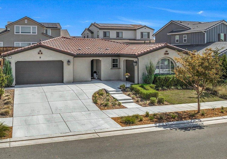 Approaching your home in Tesoro Viejo, the contemporary exterior, 3-car garage, low maintenance back yard. Pay meticulous attention to detail set the stage for the luxury that awaits inside. Enter through the door into a beautifully well-maintained home with an open floor plan that seamlessly blends indoor and outdoor living. Abundant natural light fills the spacious living room, and custom finishes create a modern and chic atmosphere. The open layout effortlessly combines the living room, designer kitchen, and dining area, complete with custom cabinetry and a wine fridge, perfect for gatherings and memorable entertaining experiences. Ample storage space is discreetly integrated throughout the home. Discover the master bedroom, flowing into a serene master bathroom with an oversized tub and shower, offering private moments of relaxation. On the opposite side of the home, you'll find two more generously sized bedrooms. Energy efficiency (SOLAR OWNED) and sustainability, boasting dual-pane windows, reducing both your carbon footprint and utility bills. Living in Tesoro Viejo means experiencing resort-style living while being just minutes away from Riverpark shopping center, a variety of restaurants, and Valley Children's Hospital. Make Tesoro Viejo your oasis of luxury and leisure, resort style clubhouse and pool offer a serene escape, the community calendar is brimming with family friendly activities, where every day feels like a vacation and where community thrives.