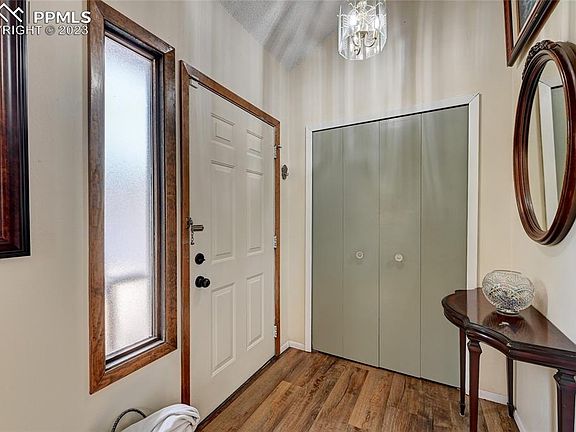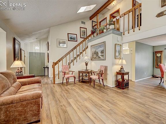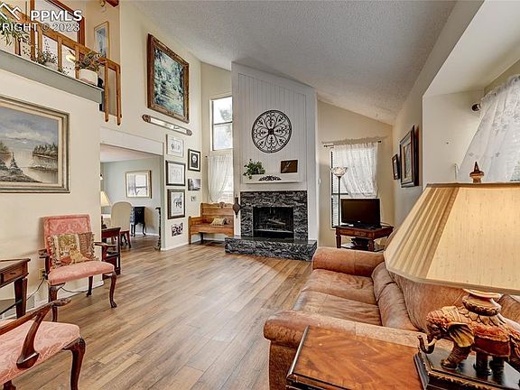Welcome to this two story condominium conveniently located in a cul-de-sac in the well-maintained Winewood Village Community. This end unit has 2 bedrooms both located upstairs which both have views of Pikes Peak. Inside the Primary Bedroom Closet comes an additional hidden closet for more storage or craft area. The Primary bedroom also has an attached bathroom. Plant enthusiast and art collectors will appreciate the vaulted ceilings and bright sky lights in the living room and a bay window. Nestled up to your wood burning fireplace with custom tile surround. There is luxury vinyl flooring throughout the whole home. The 2 car attached garage is conveniently located off the kitchen area where you can also step out to your private fenced in patio. The only shared wall is the garage. HOA includes a Club house with sauna, heated pool, jacuzzi, exterior maintenance, insurance, all water and sewer, grounds and trash and snow removal. With its warm sense of community, and only moments to shops, eateries and transport this cozy home provides all the elements for relaxing, comfortable and easy-care living.