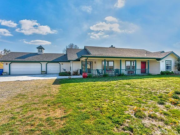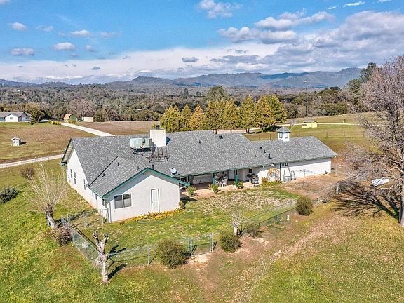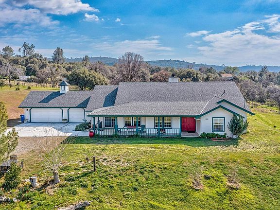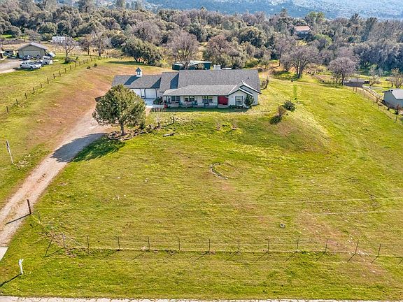 Country Charm with covered porch entry! Fenced and gated. Also, fenced for horses with a 24 x 36; 4 stalls, metal barn and pipe coral. The home has a great custom open floor plan. 3 bedroom 3 bathrooms. A breakfast eating area and a dinning room. A large walk-in pantry. Living room and den that over looks the back covered patio, yard and pasture area for the horses. The den has a fireplace and slider to the patio. A 3rd bathroom is back behind the kitchen and pantry, with a outside door to the large covered patio! Attached 3 car garage. 1st class country living from sitting on a covered porch to relaxing on the back covered patio. The home is 2,409 sq. ft. The property is 2.83 acres! Located in Coarsegold Country for $575,000. Come See!!