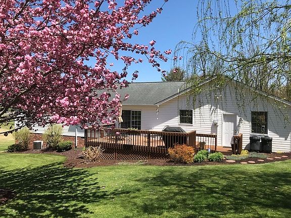 This immaculate ranch home is nestled on a pristine, corner lot with lush landscaping, a stately willow tree, blooming cherry and other mature shade trees. A welcoming entry into the spacious family room featuring a gas log fireplace, gleaming parquet flooring, accented with crown molding and access to the relaxing back deck. A formal dining room with lots of natural light from the bay windows and laminate wood flooring. The kitchen has newer stainless steel appliances, faucet & sink. A laundry closet and pantry plus access to the oversized single car garage. A grand master suite with crown molding, laminate wood flooring, walk in closet and private bath with double sink vanity. The laminate wood flooring continues to flow through bedrooms 2 & 3 and the hallway. The oversized garage and partially floored attic provide extra storage. The basement is accessed from the outside and has great space for a lawn mower & tools. Enjoy entertaining on the back deck or relax & call it a day!