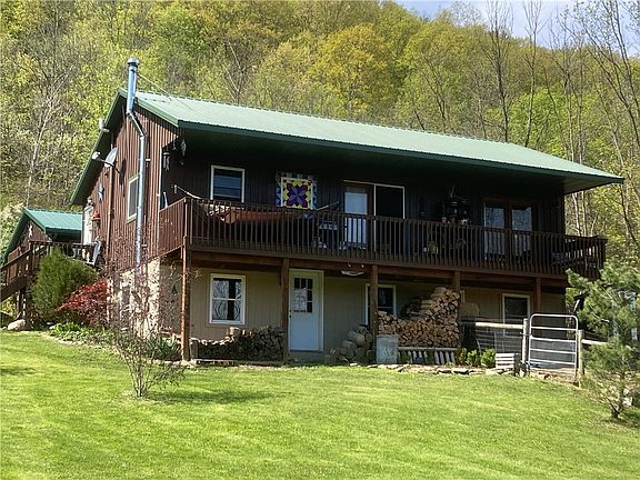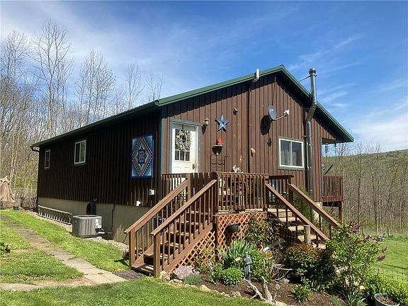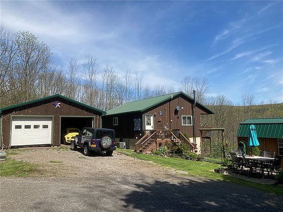 Great Cabin nestled amongst 100's of acres of NYS land! Enjoy the privacy and use of 100's of acres that surround this tranquil cabin on all sides, while being central to all the Fl region has to offer. Knotty pine finishes inside give you a true cabin feel with an open floor plan and 2 bedrooms and a full bath. Two sets of french doors lead to a covered front deck to take in the beautiful views of the hillside and pond. The partial finished walkout basement adds additional sq ft and allows for storage. The woodstove heats the whole house in the winter or use the furnace equipped with central air. Outside you'll find a 2 car garage, large shed, pergola by the pond and many perennial gardens and fruits along with a raised bed garden area for veggies, all fenced in. Bring your furry friends! Fencing and housing is in place- currently for goats and chickens. Located minutes to Canandaigua lake for lake fun, Naples for wine and the West river access is around the corner for fishing and kayaking. Hike and hunt at the 100's of acres that surround this cabin.