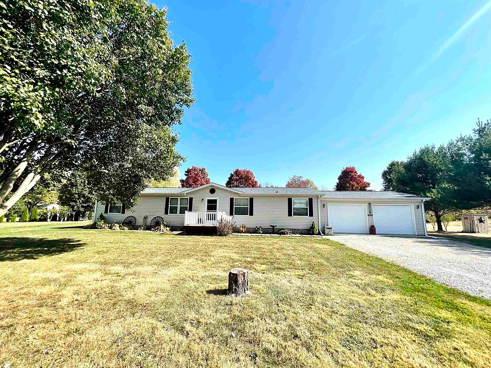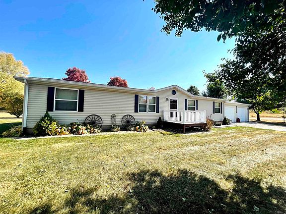 Gorgeous land here on nearly 5 acres with two garages to hold 4 cars total! If you're looking for an excellent location close to I-69, 67...this property offers plenty of room along with wildlife, fruit trees, view of the woods and lovely space for entertaining. Formal front living room, casual family room, open kitchen with gas stove and 3 beds/2 baths with a flowing floor plan...Modular home built 2004. Propane tank is rented. Come see what makes this area of Indiana so special. You'll love the country setting with horse boarding facilities nearby...close to Harrod's Hoosier Park Racing & Casino!