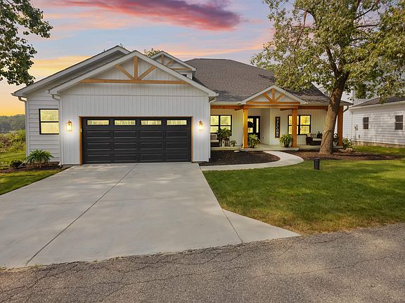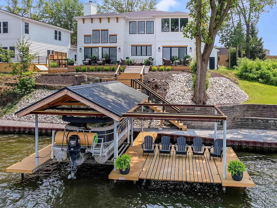 This stunning, nearly new, one-and-a-half-story modern farmhouse offers an abundance of natural light with the stunning waterfront windows and vaulted ceiling. Offering cozy ambiance with a fireplace and fabulous lakefront views from the great room, kitchen, family room, and the lakeside bedrooms. Custom-built, with luxury and functionality, the details were well planned. Just two years young, with a wonderful outdoor living space - a deck that spans beyond the width of the home, a permanent double waverunner lift that is currently used as a swim and sun pier, a covered boat lift, and a steel seawall. It's all fresh and new, just waiting for a new family to begin living the lake life! Can’t move in right away? This meticulous seller will consider a rent-back while they build their next home! A win-win for all!