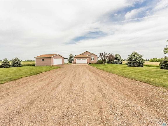Country living just minutes from Sioux Falls! Well cared for 3 bed, 3 bath Ranch home nestled on 1.17 acres. Remodeled, open concept main level with vaulted ceiling. Eat in kitchen offers generous cabinet space, updated fixtures and lighting, large center island with sink and breakfast bar for additional seating. Dining area offers convenient door to deck access. Two beds, including the sunlit master suite featuring a bay window, huge walk in closet, new tile surround shower and convenient main floor laundry. Lower level host the spacious family room with stone surround gas fireplace, 3rd bed and 3rd bath. Newer furnace and water heater. Enjoy nature and picturesque views from either the new deck or stamped concrete patio. Satisfy your green thumb by maintaining the established garden. Immaculate landscaping and mature trees surround the home. Double garage PLUS an additional 2 stall heated garage/workshop offers tons of storage potential; a floor drain and RV electrical.