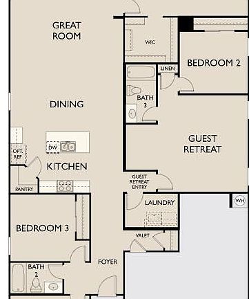 Come see our popular Sunflower floor plan at Amarillo Creek. This gorgeous Farmhouse Exterior home boasts 2,219 sq ft of living space. The residence features 4 bedrooms, 3 bathrooms, and a 2.5 Car Garage, perfect for storage space. You'll love the convenience of the separate Guest Retreat with a living space, bedroom and full bathroom. The open concept kitchen is ideal for entertaining, featuring Stone Grey shaker cabinets with Gun Metal Pull stylish cabinet hardware, 4x4 Zellige Gesso backsplash, Silver Falls granite countertops, and sleek stainless-steel appliances. Escape to your own oasis in the primary suite, where getting ready is a breeze with dual sinks, walk-in closet and a generously sized bedroom. This home feels bright and open thanks to the open concept layout, 9'' ceilings and floor to floor 6 x 36 Vicinity Grey Brown tile throughout the main areas and Benton carpet in the bedrooms. The Sunflower also includes front yard landscaping ensuring a warm welcome.