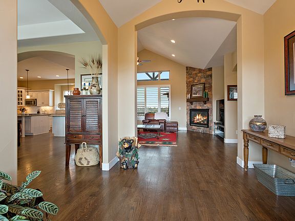 Beautifully Appointed Custom Ranch. Natural Light comes thru the Abundance of Windows that Showcases the Wonderful Views of the Preserved Vast Rolling Plains. Gorgeous Kitchen has Custom Cabinets with Slab Granite Countertops, Jenn-Aire SS Appliances, Large Island, Hardwood Flooring and High Ceilings (10') throughout. Dining Room has Built in Butlers Pantry Area. Main Floor Master includes a Fireplace, access onto the Large Trex Deck, Master Bath has large Jetted Tub with Large Shower and Walk-In Closet. Secondary Bedrooms have their own Full Baths. Main Floor Living area has Plantation Shutters, Vaulted Living Room includes a Beautiful Stone Faced Fireplace. Four Car Garage has 8 Ft. Tall Garage Doors with new Garage Door Openers w/Keypad and Custom Storage Racks. Seller has added 70K worth of Landscaping and Paved Driveway to the property with an Extra Septic System to handle more bedrooms in the full walkout 10+ foot ceiling basement to finish as you so desire.
