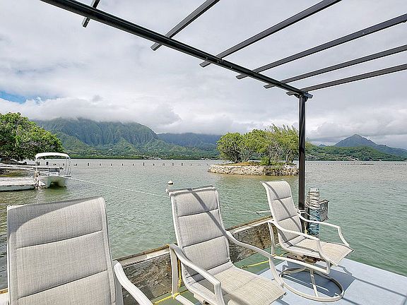 Find your peace and calm here at The Pavilion at Lihikai, a one-bedroom, one bath home on an acre of land surrounded by more than 600 feet of shoreline on Kaneohe Bay. The Pavilion is the most private place in our gated estate, and it is available for a month, or more, for an extended honeymoon, or a break from the home or city office, or simply a place to rest and recreate yourself or live in quiet comfort for the long or short term. With fishing along the shores, swimming in a private harbor and a deep water channel, and a shallow beach for sunning or wading, and pathways winding under shady hau trees, the ocean is yours. Originally built for luau and parties The Pavilion now features walls of glass in a modern minimalist style. The kitchen has all deluxe appliances and an array of cooking accessories at one end of a forty-foot counter of Carrera marble. The bath is a glass tiled Jacuzzi tub with a view, and includes a Toto bidet toilet so polite that it lifts its lid when you approach. Bedroom is air conditioned for those tropical summer nights. There is a laundry in an alcove for your own personal washer and dryer, New furnishings provided by Honolulu's Inspiration Interiors include Italian leather seating in the living room, a large dining room table, television and internet access, and a California King bed overlooking the large private garden . At your own shore there is a floating dock with views of Mokolii, Tail of the Dragon. Beyond lie the steep green ridges of the Koolau mountain range. Offshore, turtles swim in crystal clear lagoons. The famous Kaneohe Bay sandbar calls you to a long beach that rises and then disappears a few feet below the water with the changing tide. The Pavilion sleeps two at most, and because the estate includes our own private residence, we welcome adults only. Smoking is not allowed on the estate, and no one enters the secure gate without giving notice, and proof of vaccination. We welcome guests who will treasure the peace and privacy we enjoy. All utilities included ( electricity, water, sewer & refuse fees, cable & internet , weekly yard service), No Smoking allowed . Rent plus 4.712% General Excise Tax for State of Hawaii. Minimum 1 month stay . Proof of COVID VACCINATION is required.