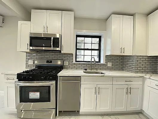 Stainless steel appliancesFloor-to-ceiling marble tilesBreakfast barSeparate dining areaLots of windowsGranite countersGlass tile backsplash