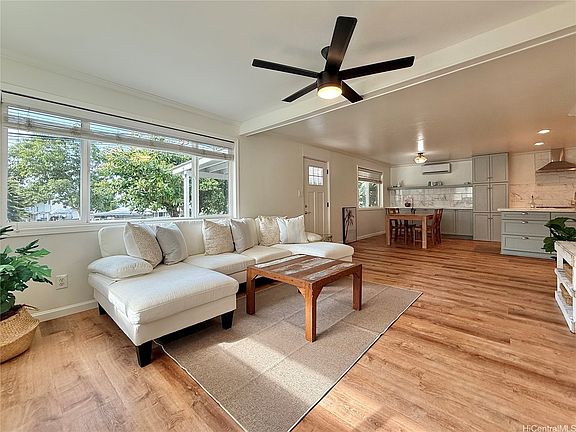 Island charm meets modern comfort in this beautifully remodeled 3BR/1BA Kaneohe cottage just blocks from the bay access and an ocean-hugging drive, minutes to shopping, dining, theatre, freeway access, and 15 minutes to Kailua or MCBH. The upgraded kitchen is a showpiece with solid wood cabinets, quartz countertops, pantry, extra storage, stainless steel appliances, and elegant gold fixtures. Inside, you’ll also find consistent luxury vinyl plank flooring, new ceiling fans throughout, and a fully renovated bathroom. Nestled on a large corner lot, the home enjoys cool trade-wind breezes, has a green fenced front yard, front porch lanai, and covered parking for 2 cars. The tropical front and back yards have mature mango, ulu, banana, lime, papaya, puakenikeni, trees and more. Move-in ready with freshly painted exterior, and space to expand. This Hawaiian-style cottage blends location, lifestyle, and thoughtful upgrades for true island living. Note: Photos have been taken within the past six months, but home will have different furniture now as Sellers prepare to move.