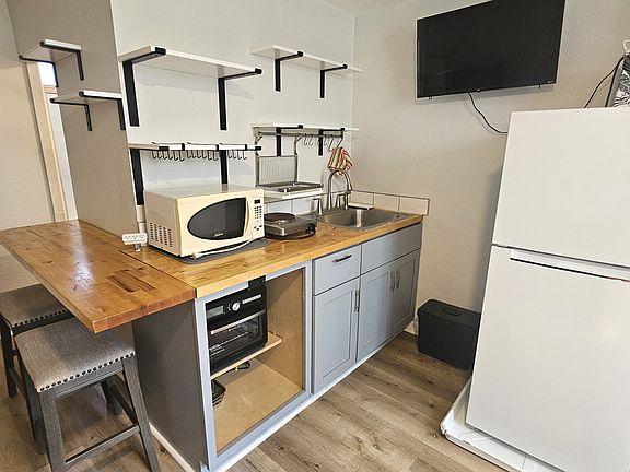 Studio, 1 covered parking with Murphy bed This is a very open and breezy unit! Open concept living and kitchen area with a huge ceiling fan helps keep the unit cool. Tons of cross breeze! Kitchen was recently renovated and has great shelf and storage space. The kitchen includes newer cabinets, a full refrigerator, cooktop, airfryer and microwave. This unit has a very large closet. Bathroom is very spacious and has a humongous shower. This home is a duplex. Private parking space and separate entrance, the only overlapping space is the carport. Utilities are charged as a seperate flat fee, tenant pays cable/internet. 1 off street parking. 1 year lease. Contact me for showings. NO VIRTUAL SHOWINGS. This home is a duplex. Private parking space and separate entrance, the only overlapping space is the carport. Utilities INCLUDED, tenant pays cable/internet. 1 off street parking. 1 year lease.