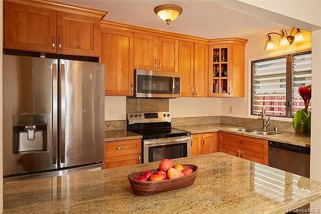 Welcome Home, your search is over! A well laid out spacious floor plan, updated kitchen and bathrooms with a full size washer and dryer. For your convenience, two side by side parking stalls with close proximity to your front door. Enclosed private lanai, pet friendly and low maintenance fee. Enjoy cool breezes and beautiful Koolau mountain views! Shopping, school and restaurants nearby.