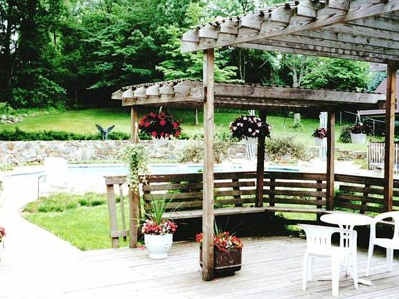 Lovely colonial on a picturesque lot .. A great inground heated gunite pool, hot tub and pool house. A overlooking the pool is a spacious deck with separate seating and half covered with a pergola. This lovely home is built for entertaining with a remolded kitchen w/corian counters.The newer S/S refrigerator, S/S built in microwave, 3 month new S/S Electric Range.Also included washer and dryer off kitchen.The family room is open to the kitchen w/wood stove for cozy nights.Formal dining room, Large living room with brick fireplace Hardwood floors downstairs. Upstairs there are 3 bedrooms and a remolded double sink bath. A large storage room is easily accessible off of the upstairs hallway. A heated finished basement, with a rec room and office.The furnace has four zones for heat.w/ Roth. new paved DW .