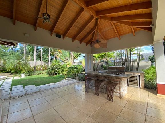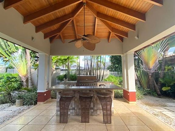 Elegant one-story Mediterranean inspired mansion in the exclusive Santa Maria neighborhood. This beautiful estate has great architecture enclaved on a 2,184 meters land and has 4,396 square feet of open and extremely refined spaces filled with natural light. The property has 3 spacious bedrooms, each with its own bathroom and large closets. A European open kitchen with professional appliances connects to the formal dining room and living room. A unique Balinesean inspired large room connects with the lush outdoor pool area and the main house. Custom made wood work in the ceilings and a unique foyer to the room makes this home feel like a retreat center... In addition, the pool area has an outstanding gazebo with an outdoor kitchen, high-end barbecue and bar. A convenient guest pool villa offers a separate area with its own bathroom, closet and space for a kitchenette. This exclusive community has security guards 24/7, tennis and basketball courts, running trails and easy access to the highways. Just ten minutes away from Condado Beach, the best schools, shopping malls and restaurants. This home is a one of a kind and great investment deal!