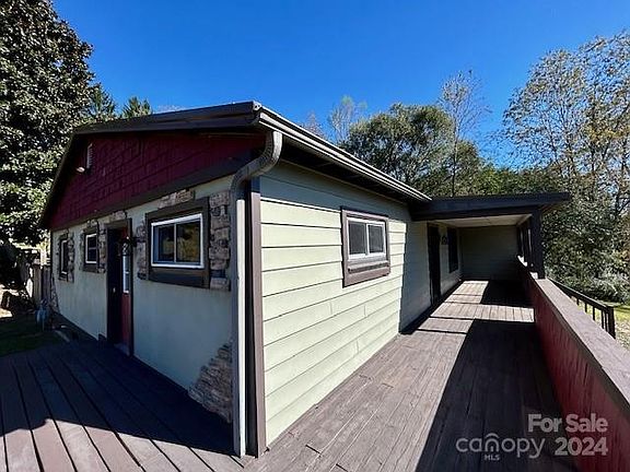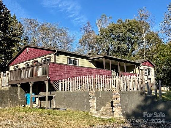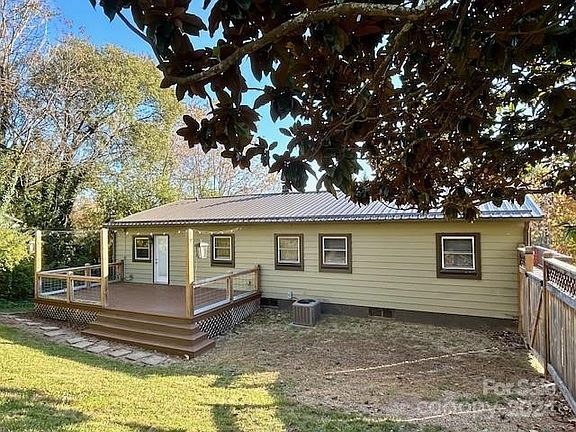 South Facing Mid Century Ranch home with Arts & Crafts touches in West Asheville outside the City Limits. The home sits on a .98 acre lot with fenced front yard and fenced rear yard. Features a metal roof, wrap deck with covered front porch and rear deck. Wood and tile flooring. Kitchen boasts granite countertops, island, dining area, stainless steel appliances, cherry stained cabinetry and tile backsplash. Living room has large picture window overlooking the covered front porch. Primary Bedroom Suite has 4 closets and an office/flex space that leads to the rear deck. Primary bathroom has double vanities, clawfoot tub and walk in tiled shower with window. 2 guest bedrooms. Laundry room has area for a sink and a full bathroom with tiled walk in shower. Unfinished walkout basement for storage. New septic tank.