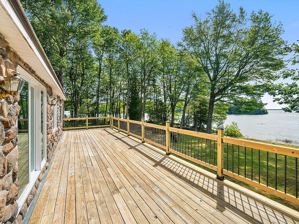 This spacious lakefront home offers room for everyone. The stone-faced exterior is complemented by an expansive deck that runs the length of the house—perfect for taking in panoramic water views. Inside, the open-concept design is anchored by the original stone fireplace, creating a warm and inviting gathering space.