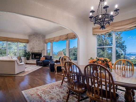 On top of Carmel Hill, in a magical, tranquil world that backs up against the Pebble Beach Preserve with views of Monterey Bay, mountains and city lights, sits this Mediterranean style home. There are many places, both indoors and out to sit and enjoy the views. The house has high ceilings, living and family rooms with fireplaces, a kitchen with granite countertops, walk-in pantry, 2 refrigerators, island with bar sink and a gas cooktop. There are wood floors in the public areas and carpet in the 4 bedrooms. The primary bedroom has a fireplace and walk-in closet. A second bedroom suite has a private entrance with a deck, full bathroom and kitchenette. There are 3.5 baths with marble floors and granite countertops. Enjoy the outdoor BBQ and firepit areas. There is additional storage under the house. The two-car garage has a mechanical room, workshop space and 4th bathroom. The driveway is designed so that you can drive up and walk to the front door without climbing stairs.